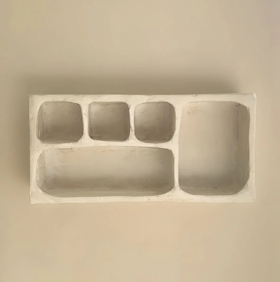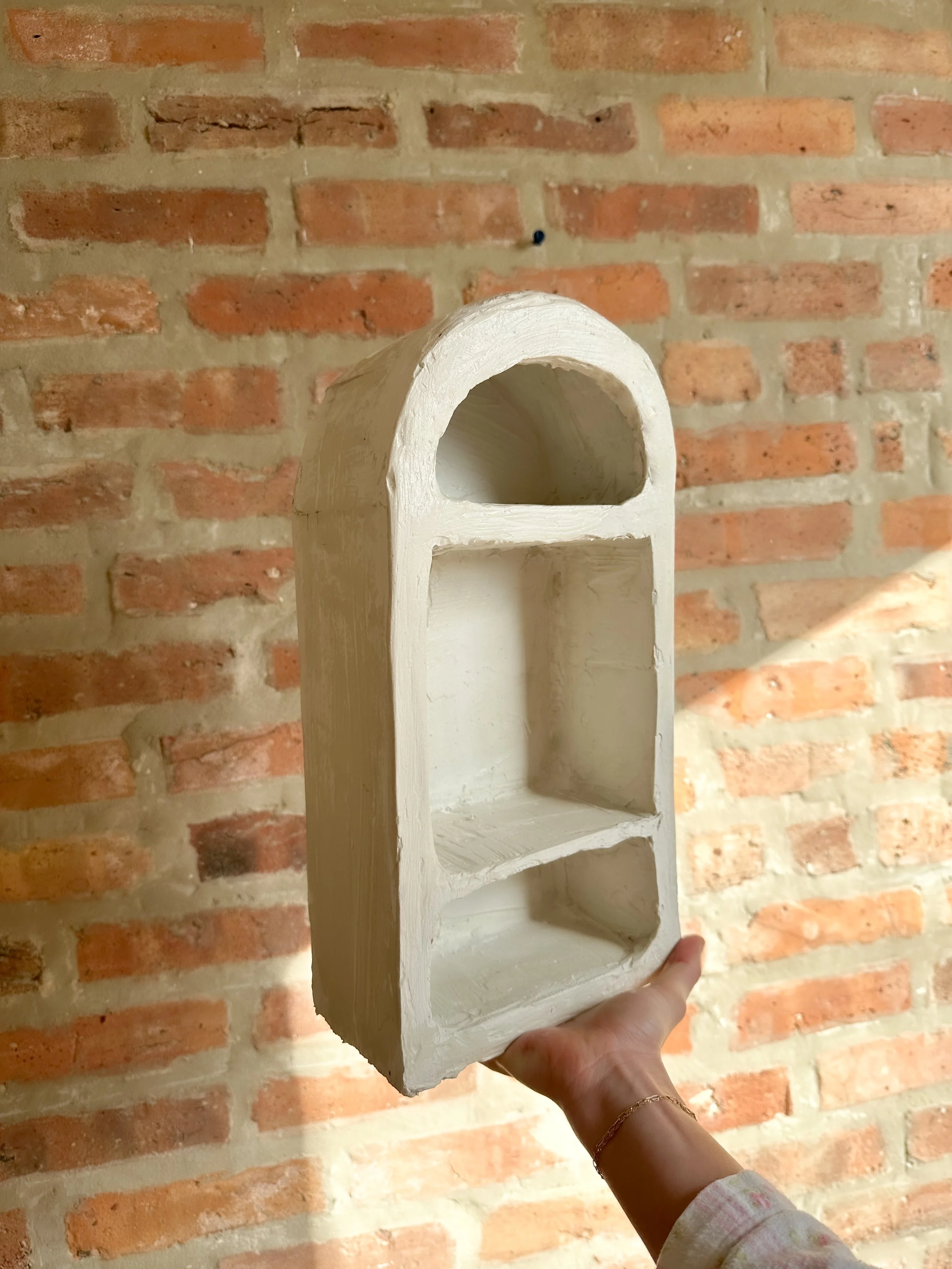 Create the shape of your shelves using cardboard and wood glue. For the larger shelf, I created pockets similar to the UO inspo, and for the second shelf, I created an arch. Let dry overnight.