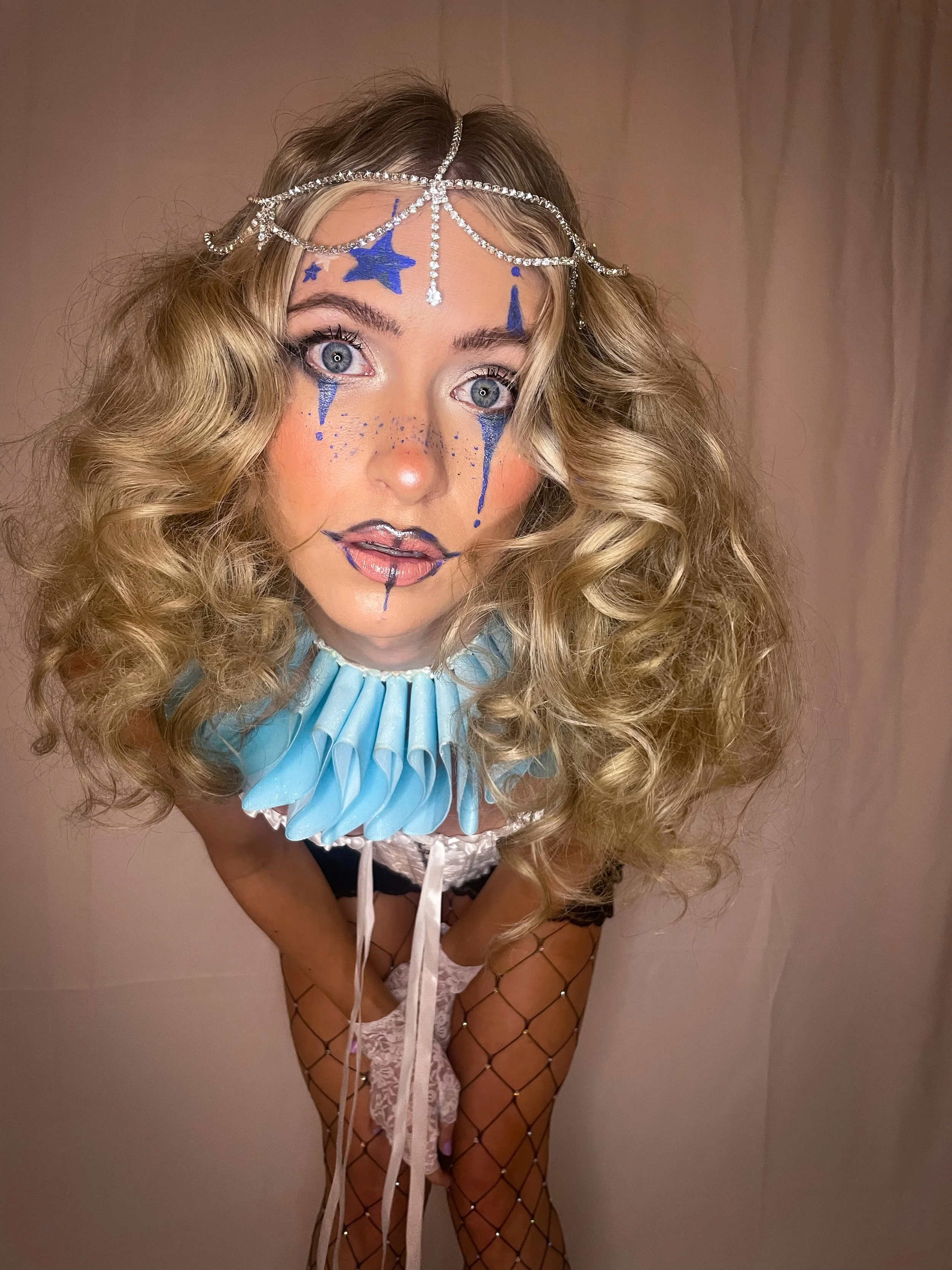For this last minute circus clown costume, I got almost everything on Amazon. I had the neck piece that I made a previous Alice in Wonderland Bunny costume. I slept in small foam rollers overnight and teased my hair to be super big. A fun photo moment with this costume is to get a fisheye camera. Accessories will always make a costume go further! Think parasols, gloves, circus batons. I used a blue eyeliner pen to draw on the face paint.